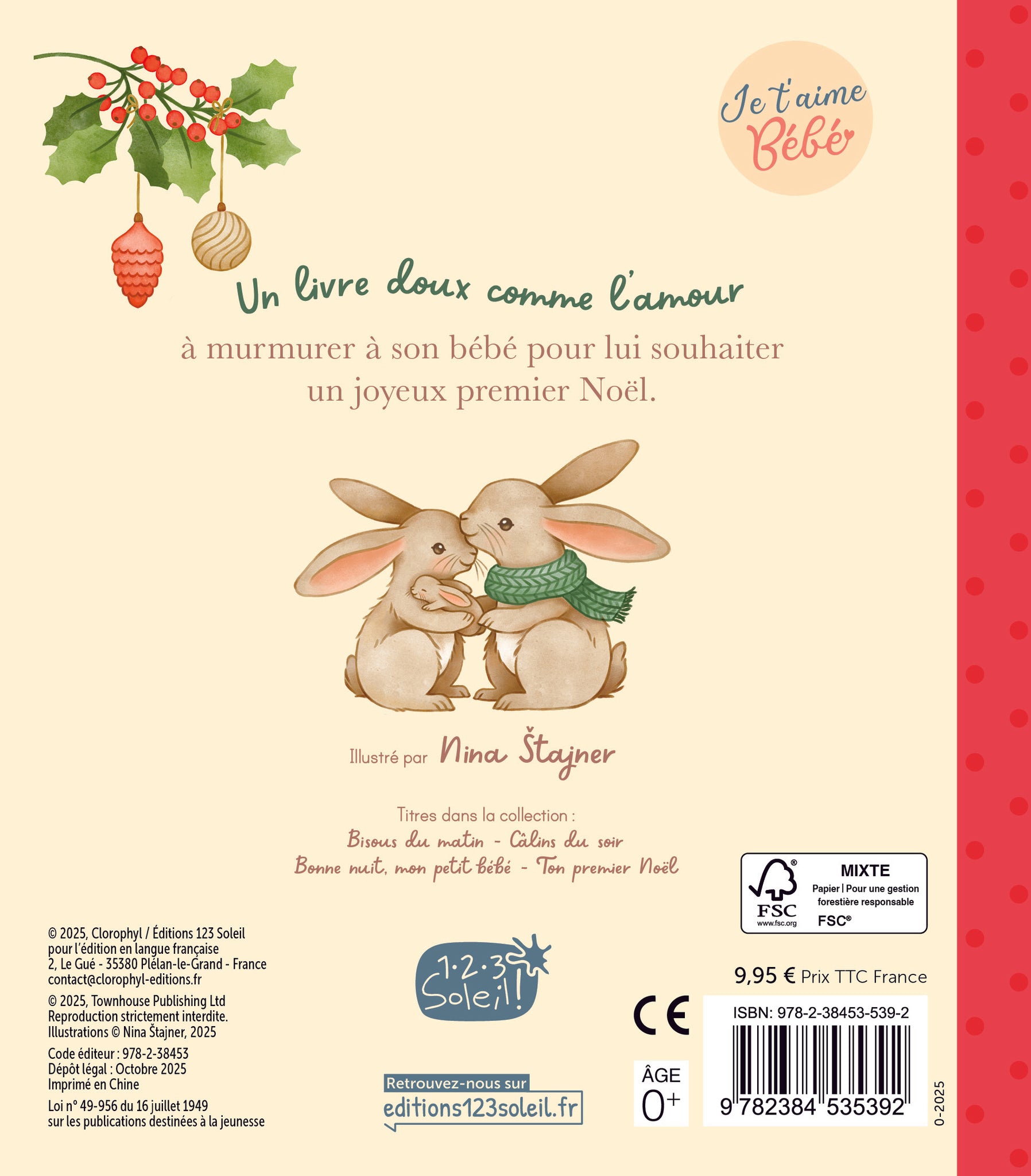 Ce livre à murmurer à son bébé pour son premier Noël, favorise les moments de partage entre le parent et son nouveau-né. Les illustrations sont tendres et délicates et les mots pleins de douceur, parlent de joie et d’amour, avec des rimes choisies. Blotti contre son parent, bébé écoute le son réconfortant de la voix lors d’un moment de lecture qui contribue à souder la relation. Le cadeau idéal à offrir à bébé ou à ses parents.