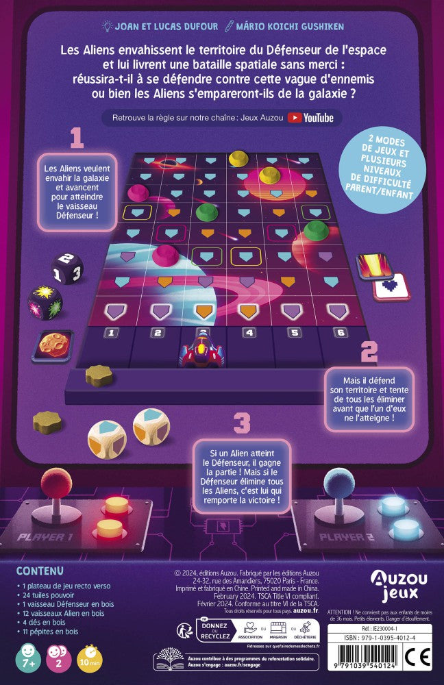 Contient : 1 plateau de jeu recto verso / 24 tuiles pouvoir / 1 pion vaisseau défenseur en bois / 12 pions vaisseaux aliens en bois / 4 dés en bois / 11 pépites en bois