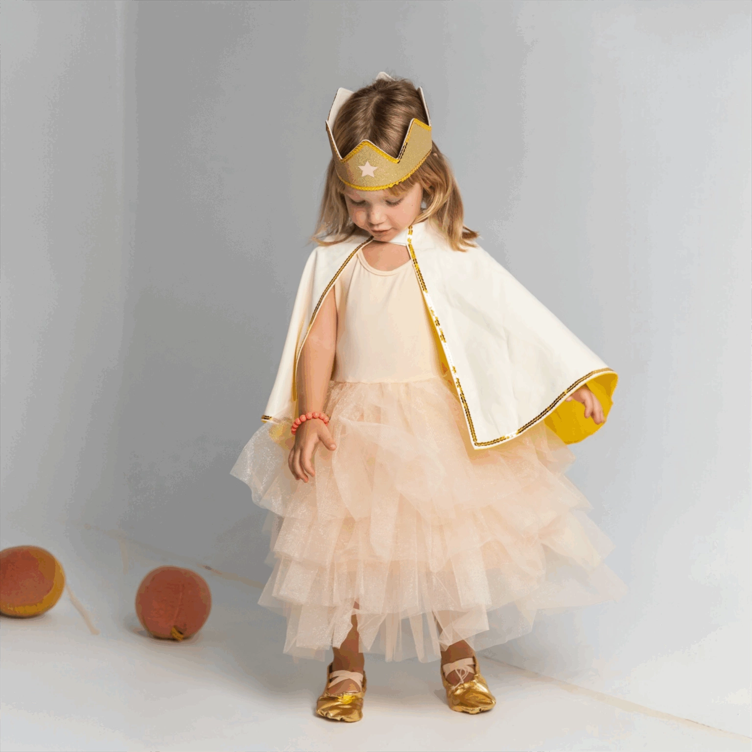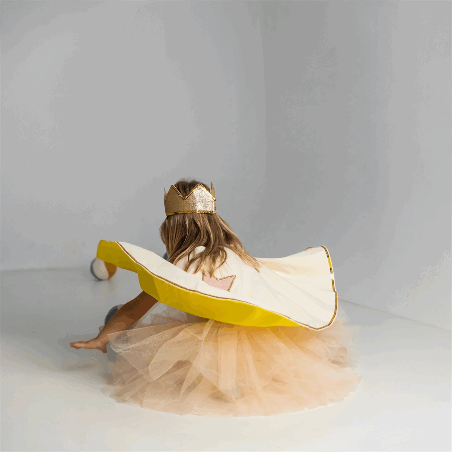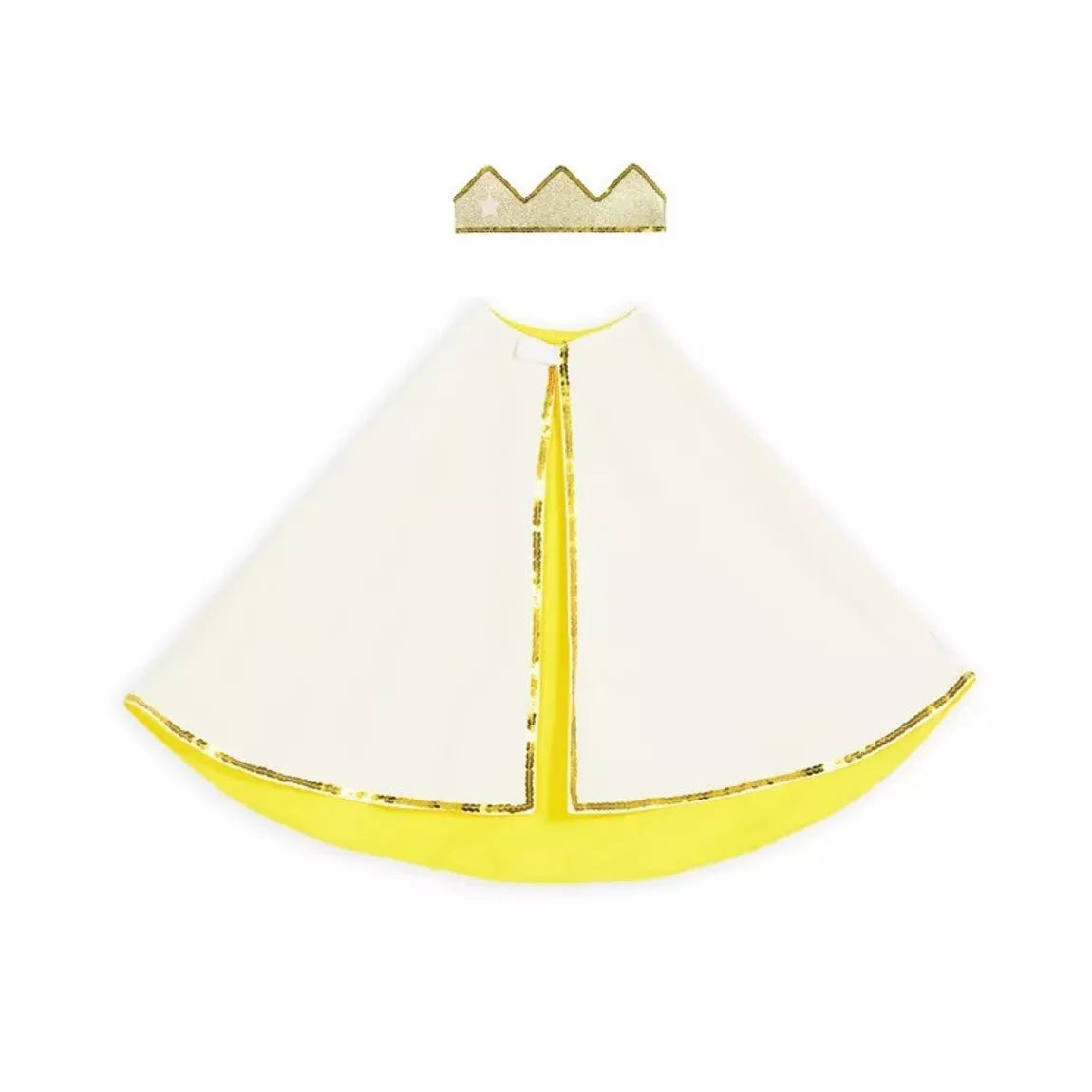 Faites briller votre enfant avec cet ensemble cape et couronne dorées! Parfait pour les anniversaires, carnavals et fêtes costumées, il est facile à enfiler grâce à sa fermeture à scratch et apporte une touche magique avec son étoile scintillante.