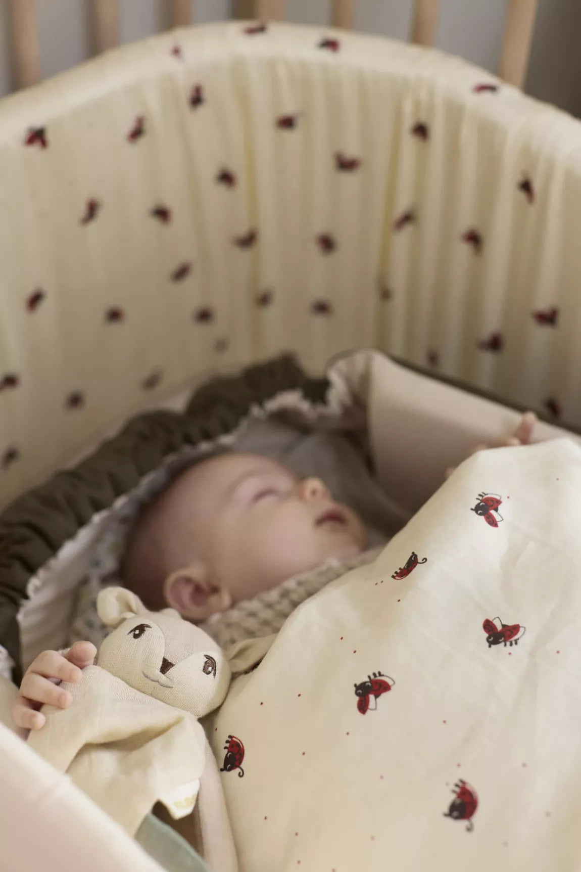 Ce doudou tout doux est fabriqué en mousseline de coton biologique certifiée GOTS. Un tissu très respirant qui évite que bébé ne se réchauffe trop lorsqu’il tient le doudou près de son visage.