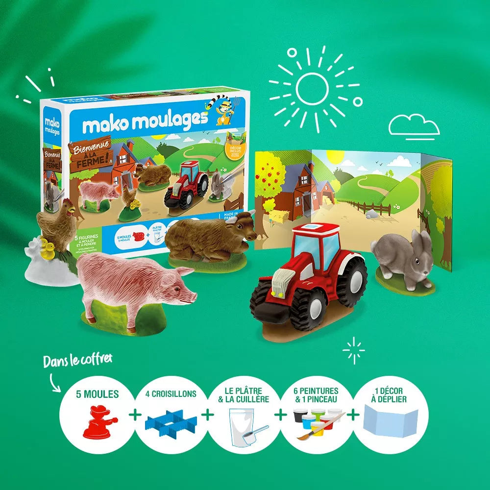 Coffret de loisirs créatifs complet de moulage de plâtre et de peinture pour enfants de plus de 5 ans pour mouler et peindre soi-même ses animaux de la ferme et le tracteur.