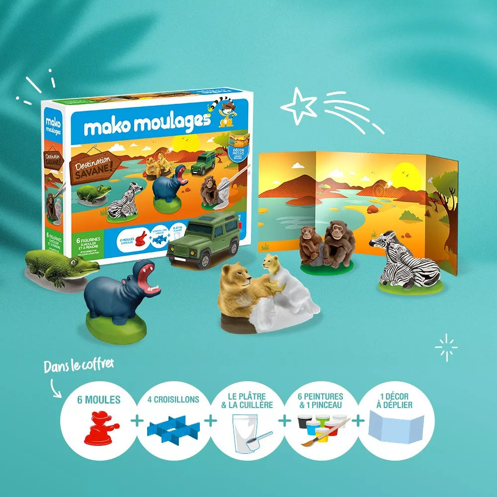 Si tu as une véritable âme d’aventurier, lance-toi dans la création des animaux de la savane en plâtre ! Fabrique ton 4×4 pour parcourir la brousse et admire la lionne et son lionceau, l'hippopotame, les singes, les zèbres, crocodile…